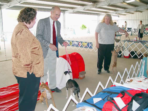 Harmony McDaniel, Terry Mayers, and Lori Niskala preparing for agility demonstration